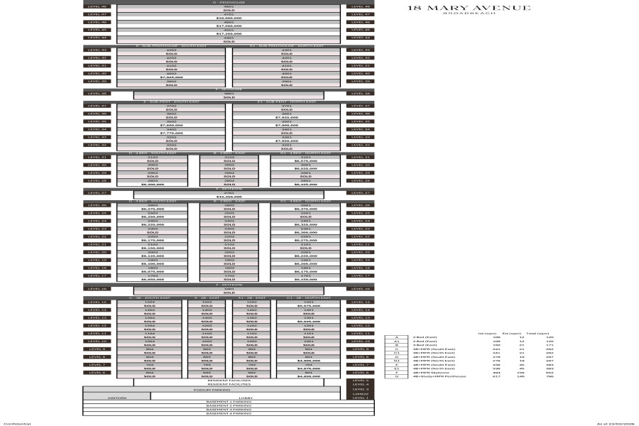 Cinq unités disponibles : U601 – 4 850 000 AUD / U701 – 4 875 000 AUD / U801 – 4 900 000 AUD / U1301 – 5 025 000 AUD / U1501 – 5 075 000 AUD