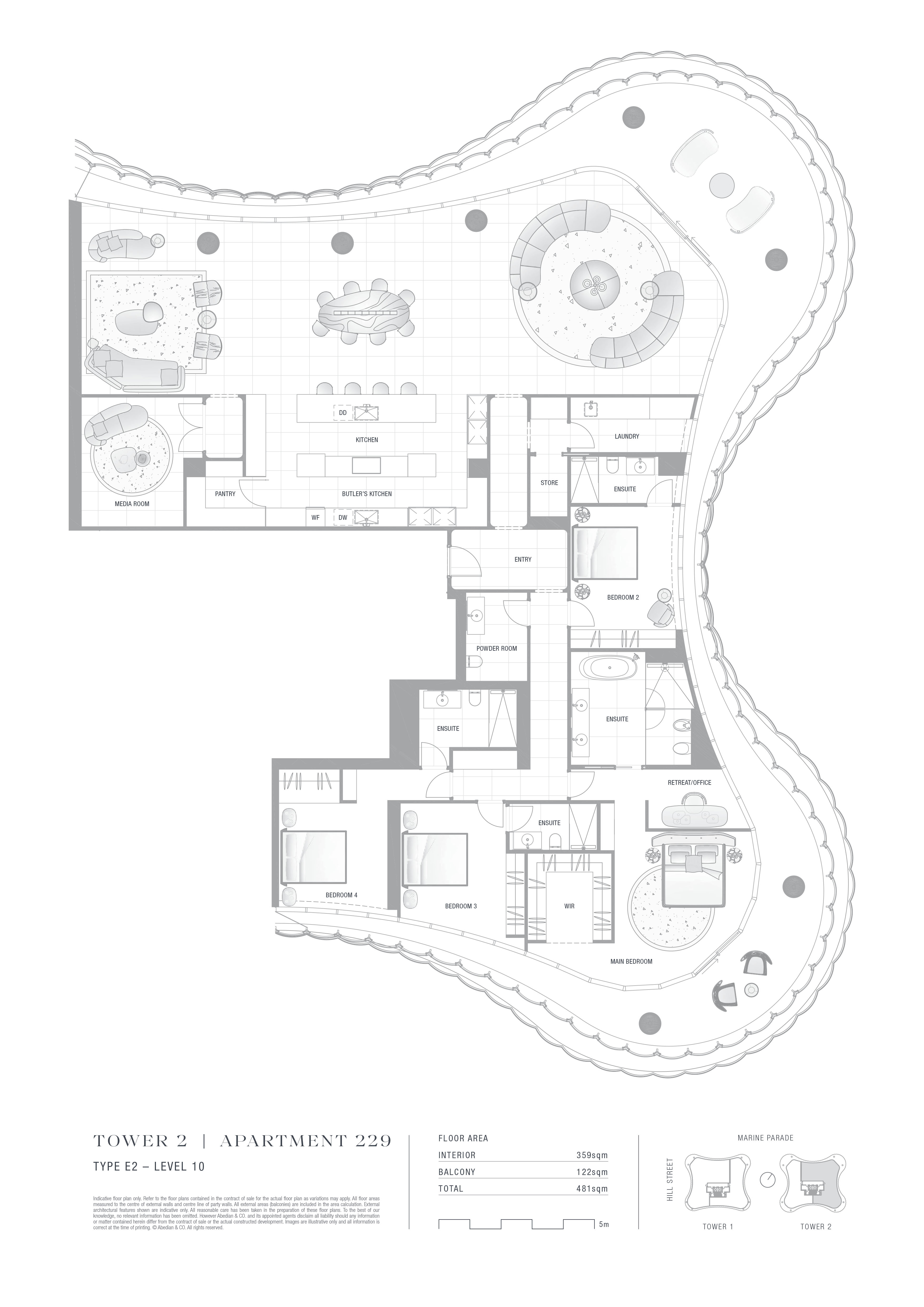 Surface intérieure : 359 m² ; surface extérieure : 122 m² ; surface totale : 481 m².