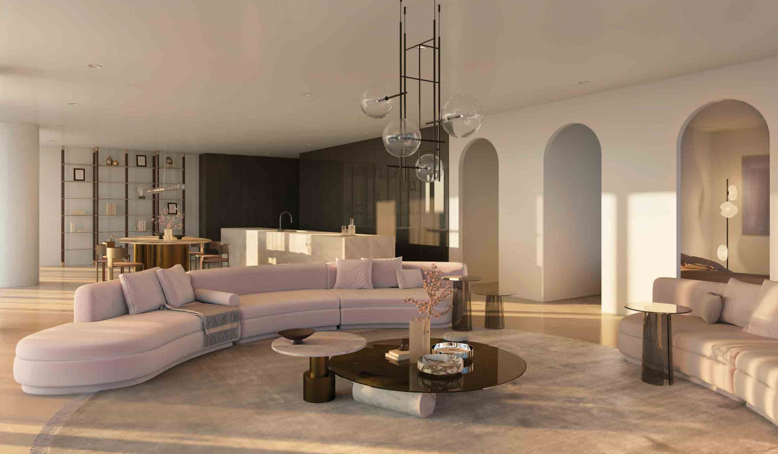 Grand séjour avec cuisine intégrée et office.